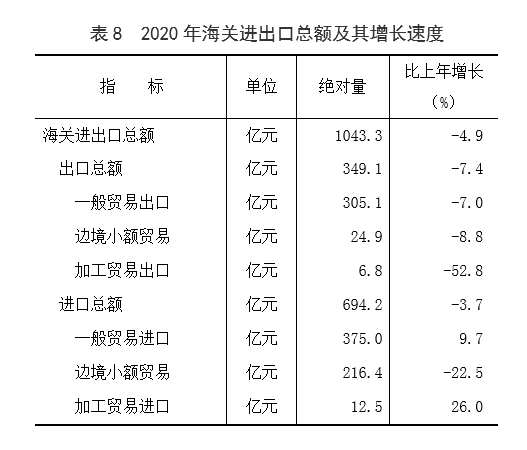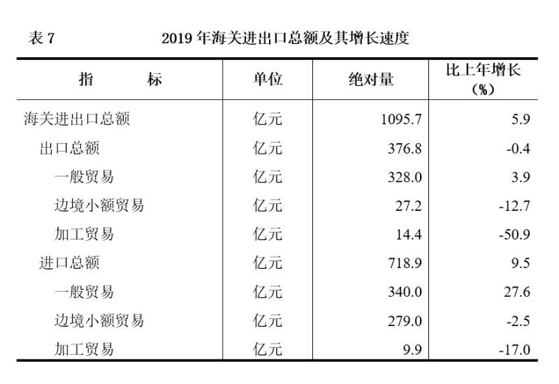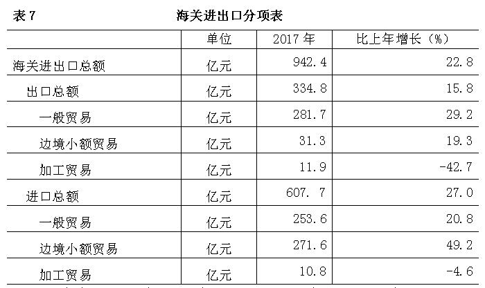 全年海关进出口总额942.4亿元(人民币,下同),比上年增长22.8%。其中,出口总额334.8亿元,增长15.8%;进口总额607.7亿元,增长27.0%。从主要贸易方式看,一般贸易进出口额达535.3亿元,占进出口总额的56.8%;边境小额贸易进出口额达302.9亿元;加工贸易进出口额达22.7亿元。