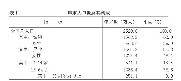 年末全区常住人口为2528.6万人,比上年增加8.5万人。其中,城镇人口为1568.2万人,乡村人口为960.4万人;常住人口城镇化率达62.0%,比上年提高0.8个百分点。男性人口为1305.2万人,女性人口为1223.4万人。全年出生人口为23.9万人,出生率为9.47‰;死亡人口为14.5万人,死亡率为5.74‰;人口自然增长率为3.73‰。