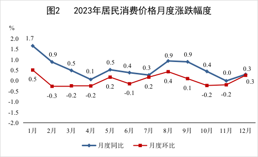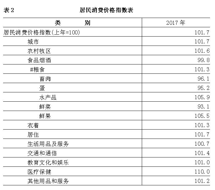 全年居民消费价格总水平比上年上涨1.7%。分城乡看,城市上涨1.7%,农村牧区上涨1.6%。分八大类消费类别看,呈现“七升一降”。衣着上涨1.3%,生活用品及服务上涨0.7%,教育文化和娱乐上涨1.0%,医疗保健上涨10.0%,居住价格上涨1.7%,交通和通信上涨1.4%,其他用品和服务上涨1.2%;食品烟酒价格下降0.2%。从工业生产者角度看,工业生产者购进价格和出厂价格分别上涨6.3%和10.6%。固定资产投资价格上涨3.4%,农产品生产价格下降4.4%。