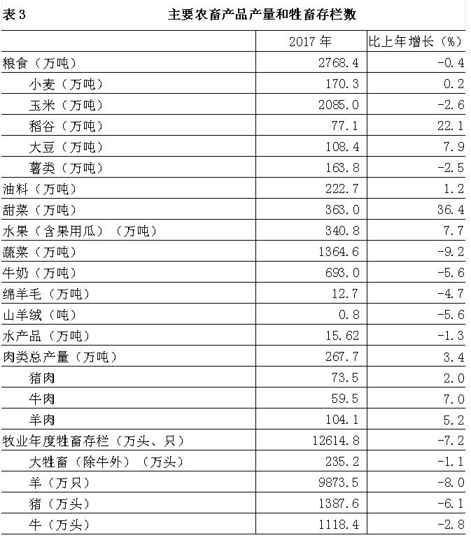 全年猪牛羊禽肉产量285.4万吨,比上年增长2.7%。其中,猪肉产量75.7万吨,比上年增长2.7%;牛肉产量77.8万吨,增长8.3%;羊肉产量108.8万吨,下降1.3%;禽肉产量23.0万吨,增长4.4%。禽蛋产量67.2万吨,增长7.4%。牛奶产量792.6万吨,增长8.0%。年末生猪存栏629.9万头,比上年末增长5.5%;牛存栏947.7万头,增长15.5%;羊存栏6180.6万只,增长0.9%;家禽存栏5929.1万只,增长7.9%。