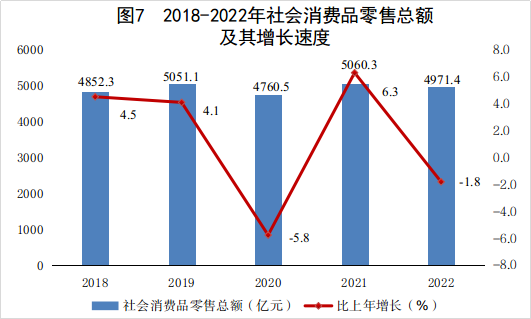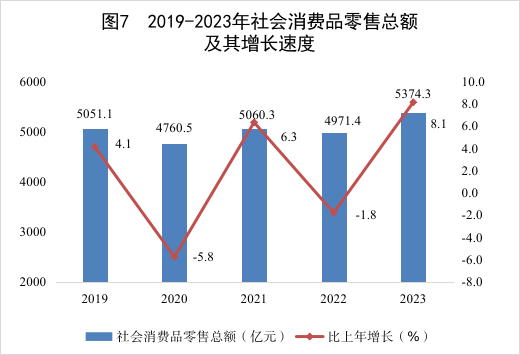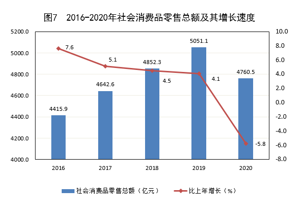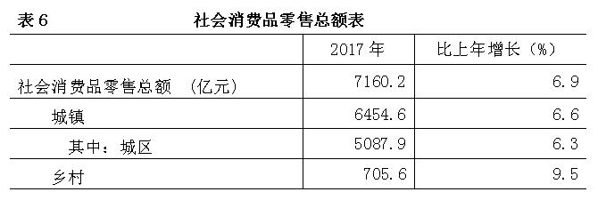 全年社会消费品零售总额7160.2亿元,比上年增长6.9%。按经营单位所在地分,城镇实现社会消费品零售额6454.6亿元,占社会消费品零售总额的90.1%,增长6.6%;乡村实现社会消费品零售额705.6亿元,增长9.5%。