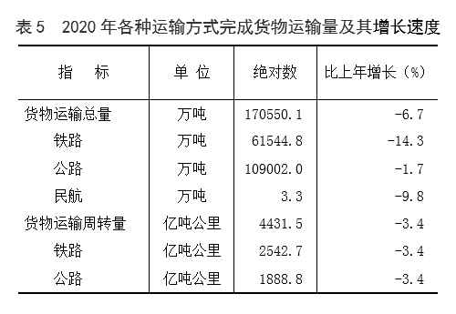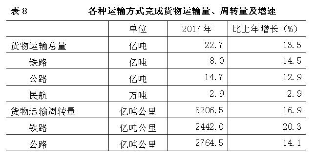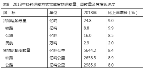 全年货物运输总量[15]25.1亿吨,比上年增长6.0%。货物运输周转量5688.8亿吨公里,增长5.9%。