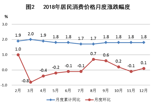 全年居民消费价格比上年上涨1.8%。分城乡看,城市上涨1.8%,农村牧区上涨1.9%。分类别看,八大类价格均呈上涨态势。食品烟酒类价格上涨2.0%,衣着类上涨1.7%,居住类上涨2.3%,生活用品及服务类上涨1.1%,交通和通信类上涨1.4%,教育文化和娱乐类上涨0.8%,医疗保健类上涨2.7%,其他用品和服务类上涨0.6%。从工业生产者角度看,工业生产者出厂价格和购进价格分别上涨3.2%和2.4%。固定资产投资价格上涨3.6%,农产品生产者价格上涨2.0%。