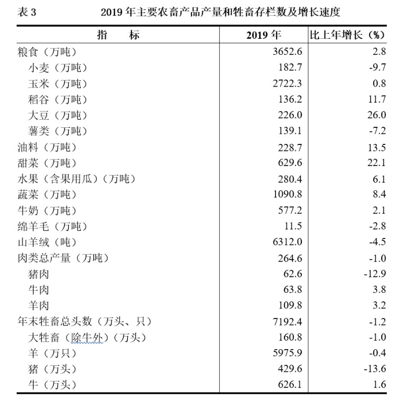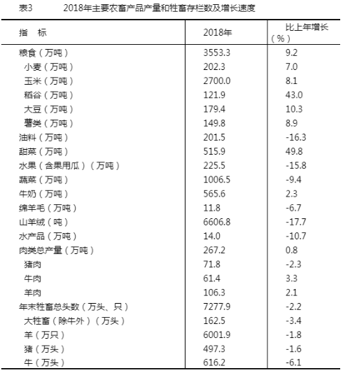 全年肉类总产量267.2万吨,比上年增长0.8%。其中,猪肉产量71.8万吨,下降2.3%;牛肉产量61.4万吨,增长3.3%;羊肉产量106.3万吨,增长2.1%;禽肉产量19.7万吨,下降2.0%。禽蛋产量55.2万吨,增长3.7%。牛奶产量565.6万吨,增长2.3%。年末牲畜存栏数7277.9万头 (只),比上年下降2.2%。其中,生猪存栏497.3万头,下降1.6%;牛存栏616.2万头,下降6.1%;羊存栏6001.9万只,下降1.8%。
