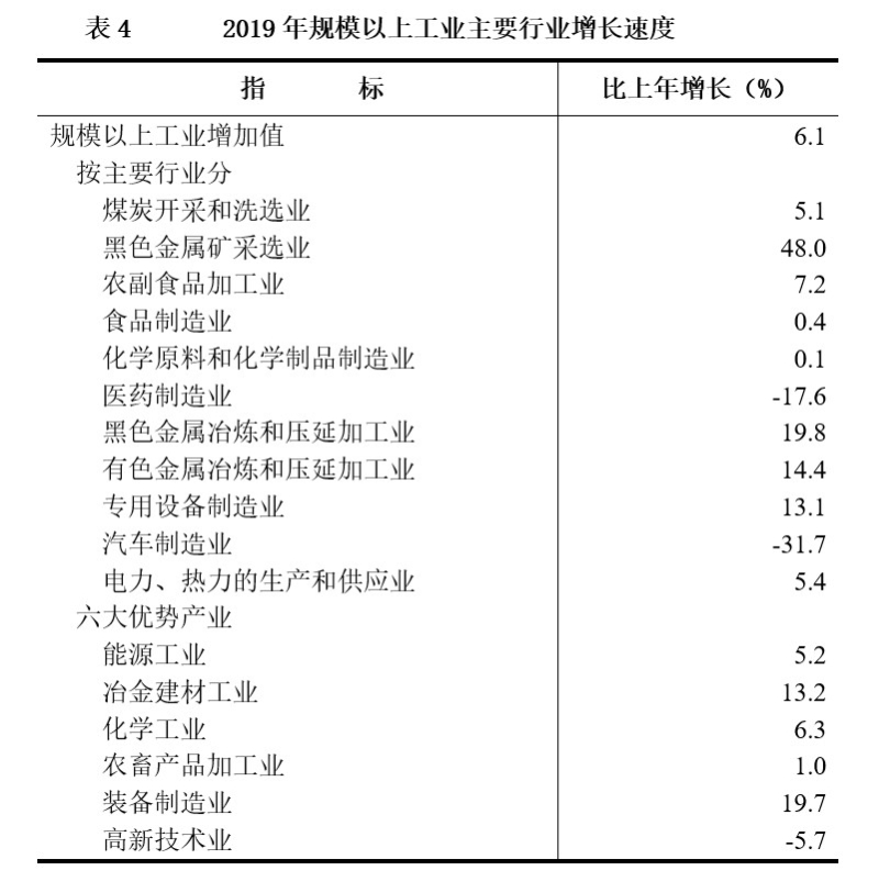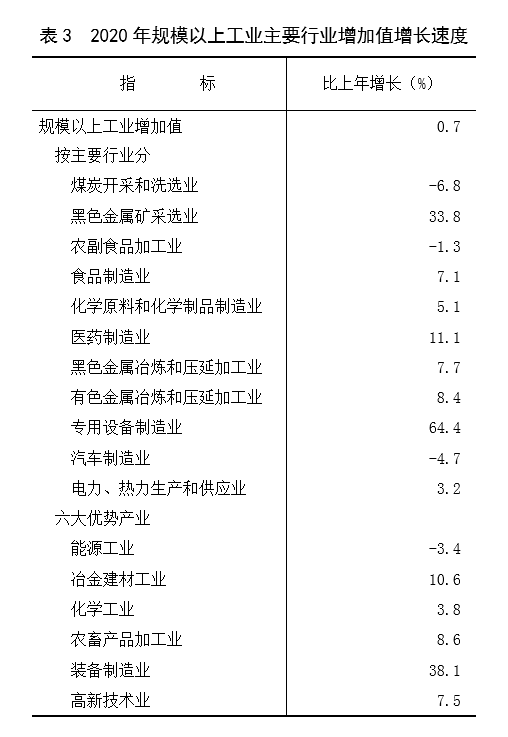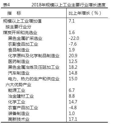 全年全部工业增加值比上年增长6.9%。其中,规模以上工业增加值增长7.1%。在规模以上工业中,分经济类型看,国有控股企业增加值增长7.8%,集体企业增长12.8%,股份制企业增加值增长7.8%,外商及港澳台投资企业增加值增长4.2%。分门类看,采矿业增长1.0%,制造业增长8.9%,电力、热力、燃气及水生产和供应业增长13.8%。在规模以上工业中,轻工业增加值下降1.4%;重工业增加值增长8.2%。