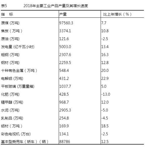 从主要工业产品产量看,全区原煤产量97560.3万吨,比上年增长7.7%;焦炭产量3374.1万吨,增长10.8%;发电量5003.0亿千瓦小时,增长13.4%,其中,风力发电量632.4亿千瓦小时,增长16.0%;钢材产量2259.5万吨,增长12.8%;铝材产量169.9万吨,增长18.5%。