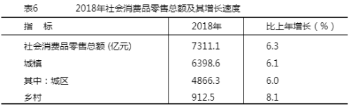全年社会消费品零售总额7311.1亿元,比上年增长6.3%。按经营单位所在地分,城镇消费品零售额6398.6亿元,增长6.1%;乡村消费品零售额912.5亿元,增长8.1%。按消费类型统计,商品零售额6207.2亿元,增长6.0%;餐饮收入额1103.9亿元,增长8.0%。