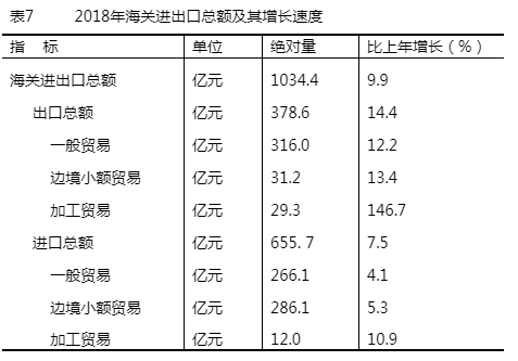 全年海关进出口总额1034.4亿元(人民币,下同),比上年增长9.9%。其中,出口总额378.6亿元,增长14.4%;进口总额655.7亿元,增长7.5%。从主要贸易方式看,一般贸易进出口额达582.1亿元,增长8.3%,占进出口总额的56.3%;边境小额贸易进出口额达317.3亿元,增长6.1%;加工贸易进出口额达41.3亿元,增长82.1%。与“一带一路”沿线国家贸易额达到699.4亿元,比上年增长14.5%。