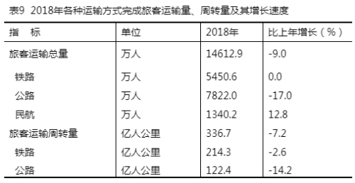 全年完成旅客运输总量14612.9万人,比上年下降9.0%。完成旅客运输周转量336.7亿人公里,下降7.2%。