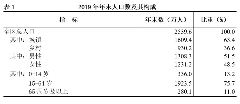 年末全区常住人口2534.0万人,比上年增加5.4万人。其中,城镇人口1589.1万人,乡村人口944.9万人;常住人口城镇化率达62.7%,比上年提高0.7个百分点。男性人口1306.2万人,女性人口1227.8万人。全年出生人口21.1万人,出生率为8.35‰;死亡人口15.1万人,死亡率为5.95‰;人口自然增长率为2.40‰。