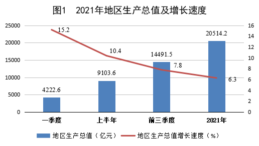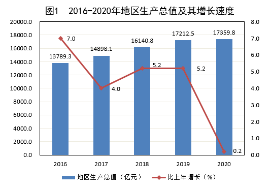 初步核算,全区地区生产总值17289.2亿元,按可比价格计算,比上年增长5.3%。其中,第一产业增加值1753.8亿元,增长3.2%;第二产业增加值6807.3亿元,增长5.1%;第三产业增加值8728.1亿元,增长6.0%;三次产业比例为10.1:39.4:50.5。第一、二、三产业对生产总值增长的贡献率分别为6.7%、37.2%和56.1%。人均生产总值达到68302元,比上年增长5.0%。