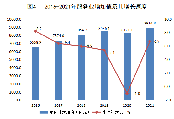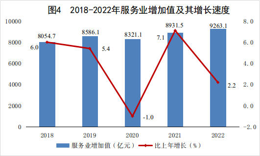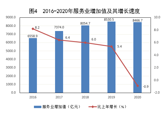 全年批发和零售业增加值2083.8亿元,比上年增长7.1%;交通运输、仓储和邮政业增加值1582.7亿元,增长5.5%;住宿和餐饮业增加值395.5亿元,增长4.0%;金融业增加值946.6亿元,增长2.5%;房地产业增加值1031.7亿元,增长1.4%。全年规模以上服务业[14]企业营业收入比上年增长8.0%。