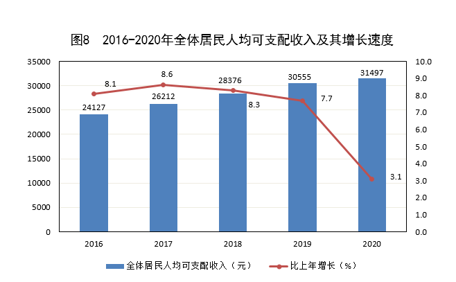 全年全体居民人均可支配收入28376元,比上年增长8.3%,扣除价格因素后实际增长6.4%。全体居民人均生活消费支出19665元,增长3.8%。