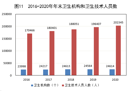 年末全区共有医疗卫生机构26740个。其中,医院861个;基层医疗卫生机构25480个,其中乡镇卫生院1217个,社区卫生服务中心(站)1321个,门诊部1190个,村卫生室12772个;专业公共卫生机构323个,其中疾病预防控制中心118个。卫生技术人员249187人,其中执业医师和执业助理医师100570人,注册护士106855人。医疗卫生机构床位173628张。其中,医院139133张,乡镇卫生院21581张。