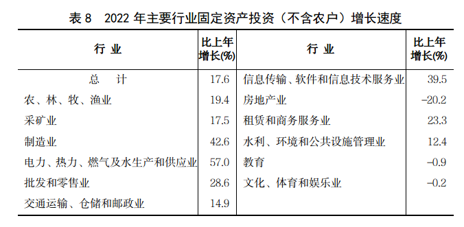 全年规模以上工业中,煤炭开采和洗选业比上年增长1.4%,食品制造业增长18.3%,石油、煤炭及其他燃料加工业增长15.3%,化学原料和化学制品制造业增长2.5%,非金属矿物制品业增长20.2%,有色金属冶炼和压延加工业增长11.9%,专用设备制造业增长13.1%,电气机械和器材制造业增长89.2%,计算机、通信和其他电子设备制造业增长3.5%,电力、热力生产和供应业增长15.5%。