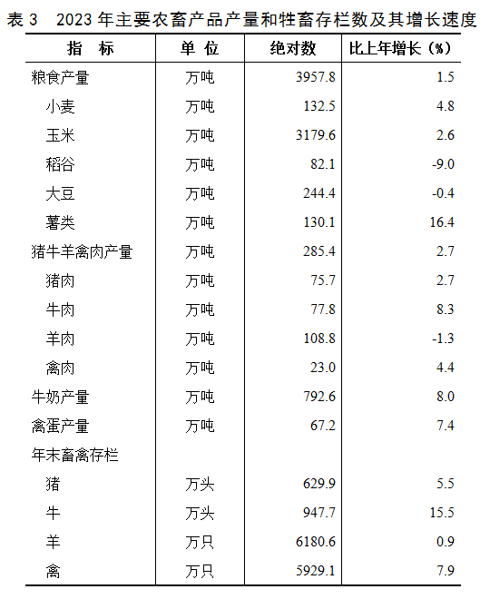 全年农作物总播种面积893.5万公顷。其中,粮食作物播种面积701.2万公顷,比上年增长0.4%。粮食产量4100.5万吨,比上年增长3.6%。其中,玉米产量3276.2万吨,增长3.0%;大豆产量248.1万吨,增长1.5%;薯类(折粮)169.8万吨,增长30.5%。