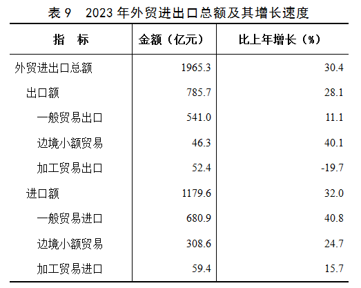 全年外贸进出口总额2073.6亿元,比上年增长5.8%。其中,出口852.8亿元,增长9.2%;进口1220.8亿元,增长3.6%。从主要贸易方式看,一般贸易进出口额1303.4亿元,增长7.0%,占进出口总额的比重为62.9%;边境小额贸易进出口额292.9亿元;加工贸易进出口额64.2亿元。对共建“一带一路”[24]国家进出口额1679.3亿元,比上年增长9.6%。