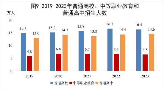 年末全区共有研究生培养单位12个,招生(含非全日制)1.5万人,在学研究生(含非全日制)4.3万人,比上年增长6.6%。普通高校54所,招生17.6万人,在校生55.3万人,毕业生15.4万人。中等职业教育学校171所,招生5.9万人,在校生17.7万人,毕业生6.1万人。普通高中323所,招生14.9万人,在校生43.7万人,毕业生13.8万人。初中709所,招生23.4万人,在校生67.7万人,毕业生22.1万人。小学1597所,招生20.0万人,在校生137.4万人,毕业生23.4万人。幼儿园在园幼儿50.0万人。