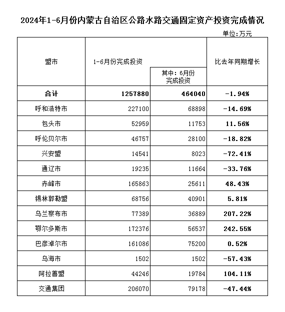 2024年1-6月份全区公路水路交通固定资产投资完成情况(分单位)