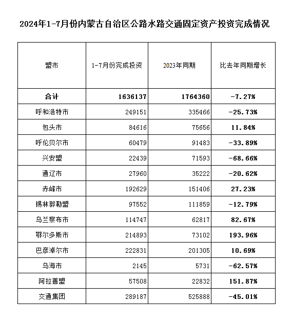 2024年1-7月份全区公路水路交通固定资产投资完成情况(分单位)