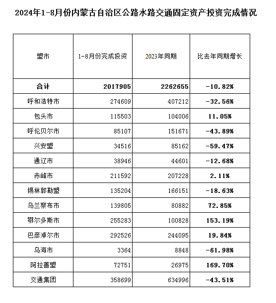 2024年1-8月份全区公路水路交通固定资产投资完成情况(分单位)