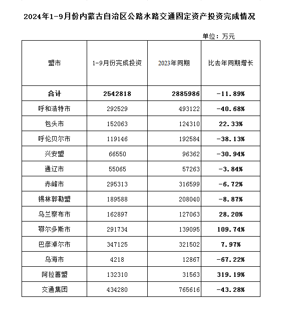 2024年1-9月份全区公路水路交通固定资产投资完成情况(分单位)