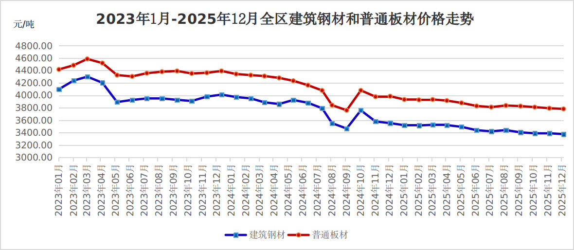12月份,建筑钢材、普通板材全区综合平均价格分别为每吨3374.31元、3781.79元。与2025年11月相比(下称环比),建筑钢材、普通板材价格分别略降0.45%、0.28%;与2024年12月相比(下称同比),分别下降5.02%、5.12%。