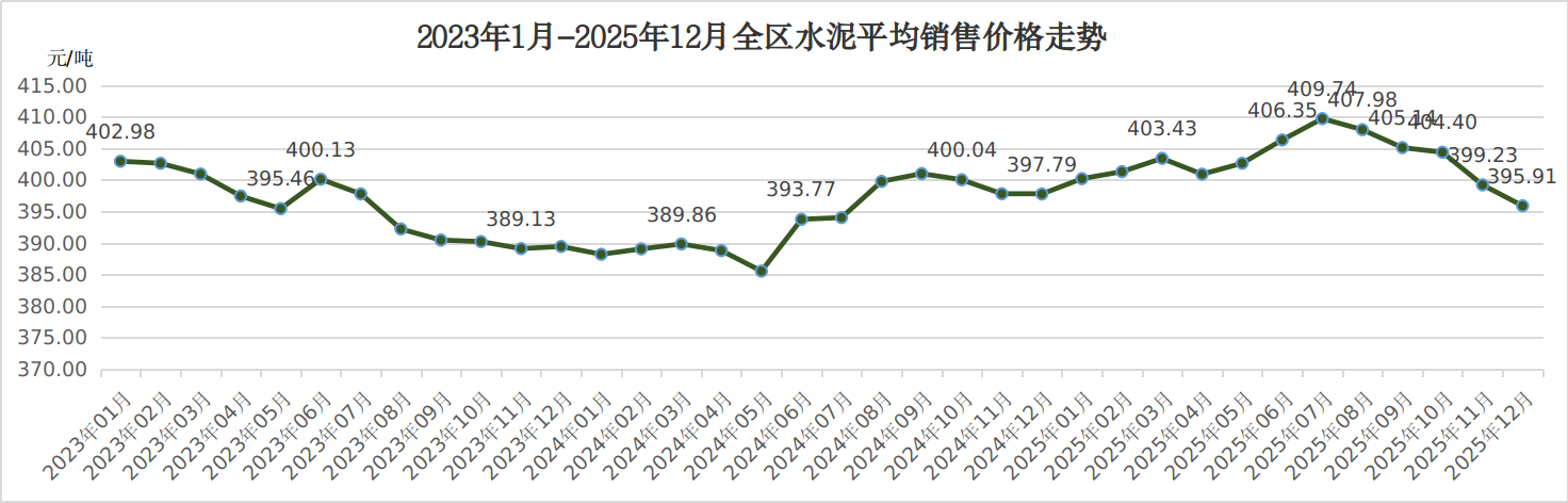 12月份,三种硅酸盐水泥全区平均销售价格为395.91元/吨,环比价格略降0.83%,同比价格略降0.47%。