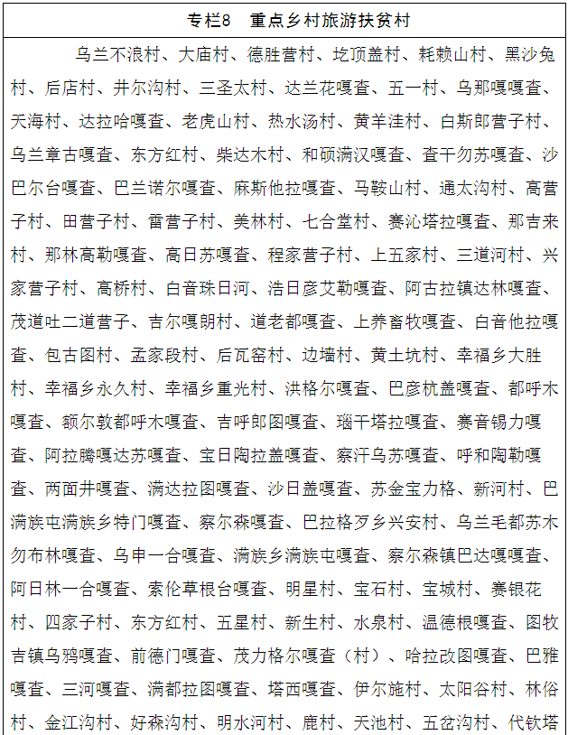 乡村旅游示范村建设行动。力争打造100个国家和自治区级乡村旅游示范村,每个盟市打造50个左右盟市级乡村旅游示范村,每个旗县打造10个左右旗县级乡村旅游示范村,积极发展乡村观光示范村、乡村度假示范村和乡村专项旅游示范村等,完善乡村旅游示范村体系。