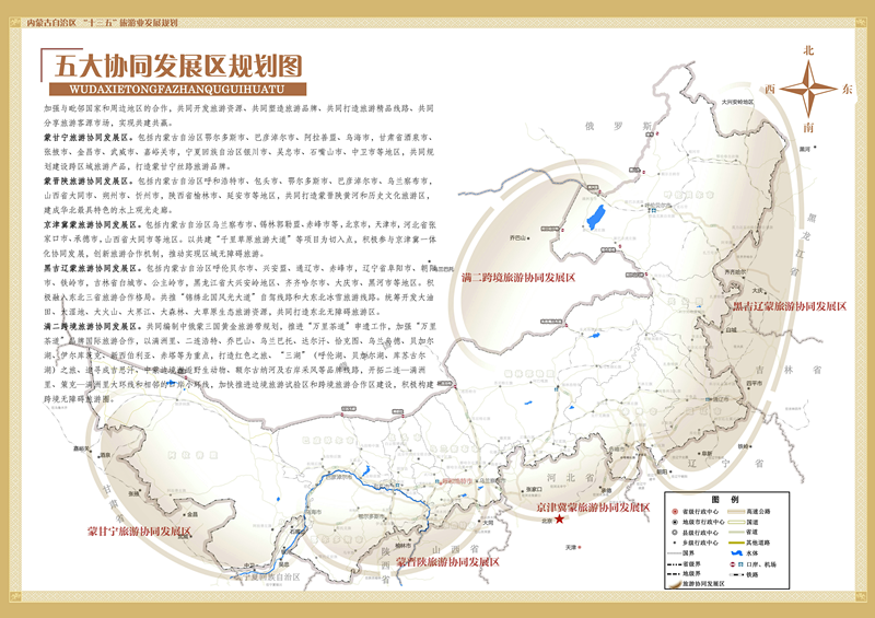 蒙晋陕旅游协同发展区。包括内蒙古自治区呼和浩特市、包头市、鄂尔多斯市、巴彦淖尔市、乌兰察布市,山西省大同市、朔州市、忻州市,陕西省榆林市、延安市等地区,共同打造蒙晋陕黄河和历史文化旅游区,建成华北最具特色的水上观光走廊。