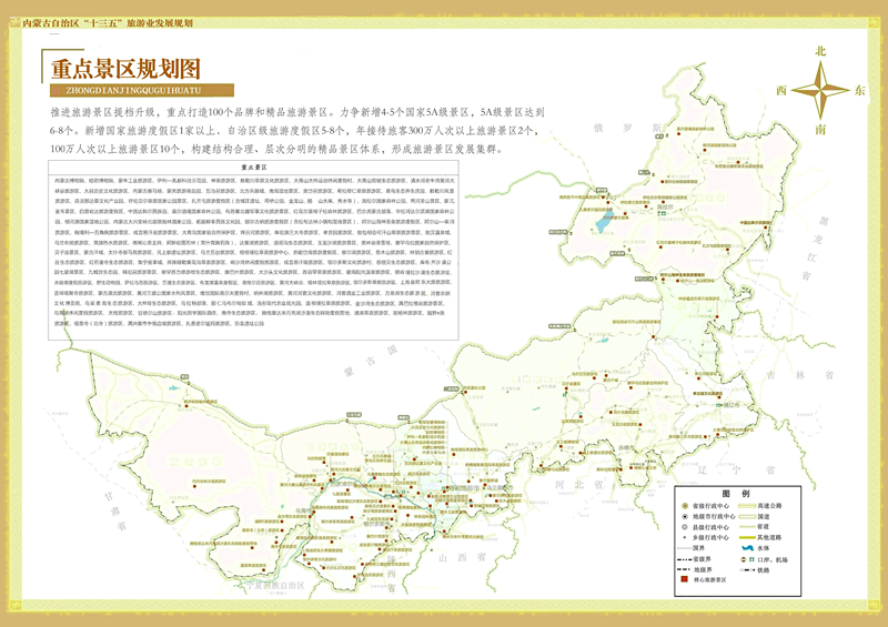 按照旅游资源分布和区位特点,着力建设东北林草文化四季全生态旅游片区(呼伦贝尔市、兴安盟、通辽市)、环京津冀草原风情旅游片区(赤峰市、锡林郭勒盟、乌兰察布市)、敕勒川现代草原文明旅游片区(呼和浩特市、包头市、鄂尔多斯市、巴彦淖尔市)、西北水沙胡杨秘境探险旅游片区(乌海市、阿拉善盟)。依托草原、森林、沙漠、冰雪、温泉、河湖、湿地、地质奇观、中俄蒙口岸、民俗历史文历史文化等十大旅游资源,全面展示壮美内蒙古。