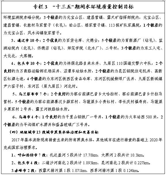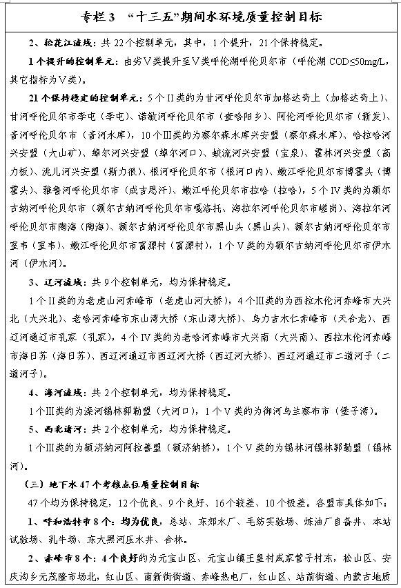 ——污染物排放总量控制目标。到2020年,全区化学需氧量、氨氮、二氧化硫和氮氧化物排放总量分别控制在77.66万吨、4.37万吨、109.56万吨和101.37万吨以内,比2015年的83.56万吨、4.69万吨、123.09万吨和113.88万吨分别减少7.1%、7%、11%和11%。呼伦湖、乌梁素海汇水范围内总氮减少10%。