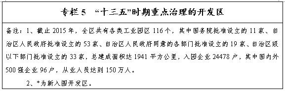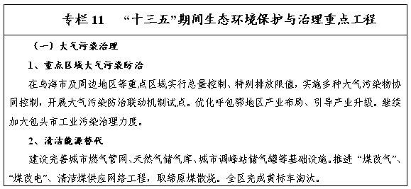 为有效推进主要任务实施,保障规划目标实现,规划重点实施大气污染治理、水污染治理、土壤污染治理、生态保护与修复、重点领域环境风险防范、环境监管能力建设等六大类重点工程。建立项目库,强化项目绩效管理。项目投入以企业和地方政府为主,国家和自治区财政应当予以支持。