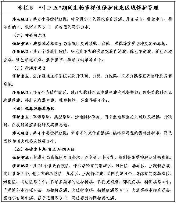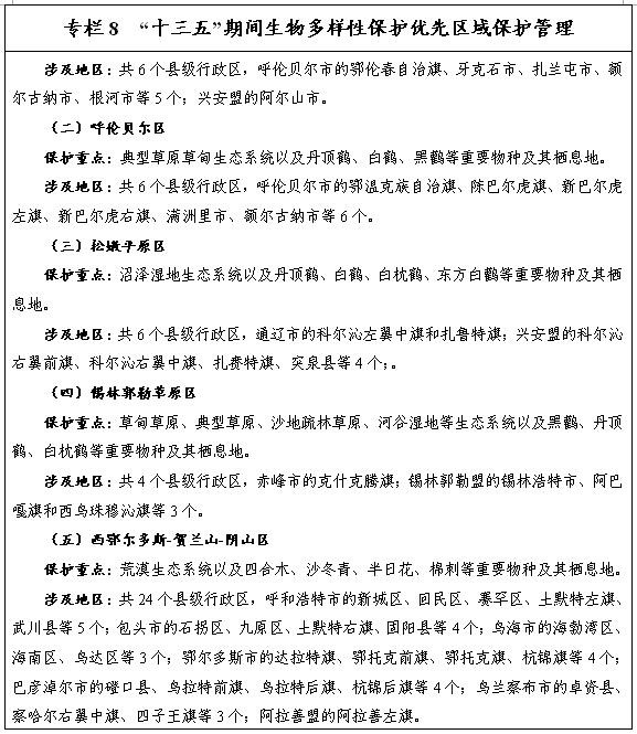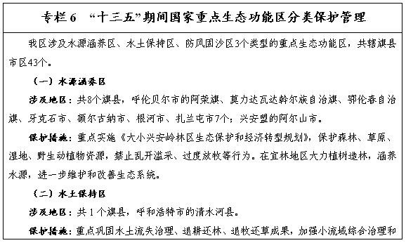 西部区坚持生态优先,强化生态环境保护,提升生态安全屏障功能,合理开发煤炭、天然气等战略资源和生态旅游、农畜产品等特色资源;中部区以资源环境承载力为基础,优化城市群发展,有序承接产业转移,加快发展现代农牧业和先进制造业,支持能源产业转型发展;东部区加强大兴安岭等森林生态系统保护和防沙带建设,全面停止天然林商业性采伐,强化湿地和农畜产品产地土壤环境保护,推动老工业基地振兴。