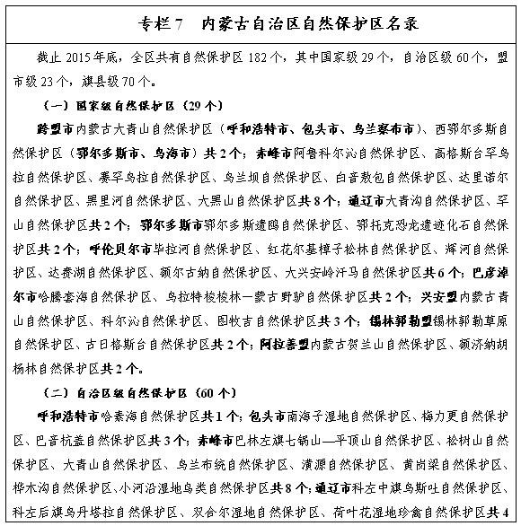 加快建设我国北方重要生态安全屏障,生态环境状况实现总体遏制、局部好转,美丽内蒙古建设取得明显成效。深入实施五大生态(京津风沙源治理、“三北”防护林建设、天然林保护、退耕还林还草、水土保持工程)和六大区域性绿化(公路、城镇、村屯、矿区园区、黄河两岸、大青山前坡)等重点生态工程。森林覆盖率和草原植被盖度“双提高”,森林面积由3.6亿亩增加到3.8亿亩,草原植被盖度由37%提高到44%;荒漠化和沙化土地“双减少”,分别减少625万亩和515万亩,减少面积均居全国首位。湿地保有量达9000万亩,沙化土地和水土流失治理面积分别为4.13和2.43万平方公里。完成全区生态环境十年变化(2000—2010年)调查评估。优化调整各级自然保护区,6个晋升为国家级、4个晋升为自治区级。积极推进生态创建工作,截止2015年底,8个旗县开展了国家级生态旗县创建工作,3个旗县通过环保部验收; 100个乡镇(苏木)、4个村(嘎查)获得国家级生态乡镇(苏木)和生态村(嘎查)命名,70个乡镇(苏木)、113个村(嘎查)获得自治区级命名。