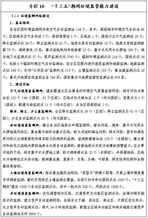 继续强化监测、监察、在线监控、科研、信息、宣教、固废、统计等基础能力建设,特别加强基层环保能力建设,全面提升自治区环境监管能力建设水平。从自治区到旗县各级深入推进环境监测、监察、在线监控、信息、辐射、宣教等监管能力运行保障机制建设,强化生态环境监测网络、污染源在线监控网络、环境信息网络等的运行保障,根据事权完善经费保障渠道和机制,按照有关规定,保障监测、监察、预警与应急、信息、污染源在线监控等运行经费。力争到2020年,我区环境监测、监察、在线监控、环境信息、辐射环境监测、宣教、固废管理等监管能力机构建设能够实现自治区、盟市、旗(县、区)三级全覆盖,综合业务能力取得突破性进展。