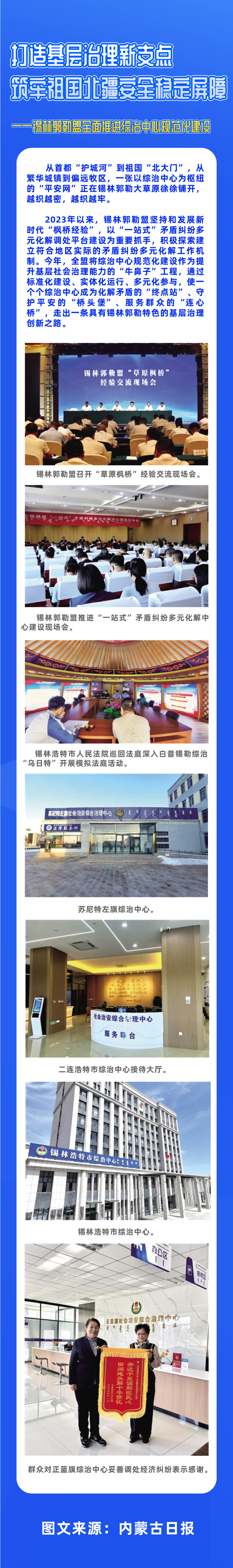 2023年以来,锡林郭勒盟坚持和发展新时代“枫桥经验”,以“一站式”矛盾纠纷多元化解调处平台建设为重要抓手,积极探索建立符合地区实际的矛盾纠纷多元化解工作机制。今年,全盟将综治中心规范化建设作为提升基层社会治理能力的“牛鼻子”工程,通过标准化建设、实体化运行、多元化参与,使一个个综治中心成为化解矛盾的“终点站”、守护平安的“桥头堡”、服务群众的“连心桥”,走出一条具有锡林郭勒特色的基层治理创新之路。