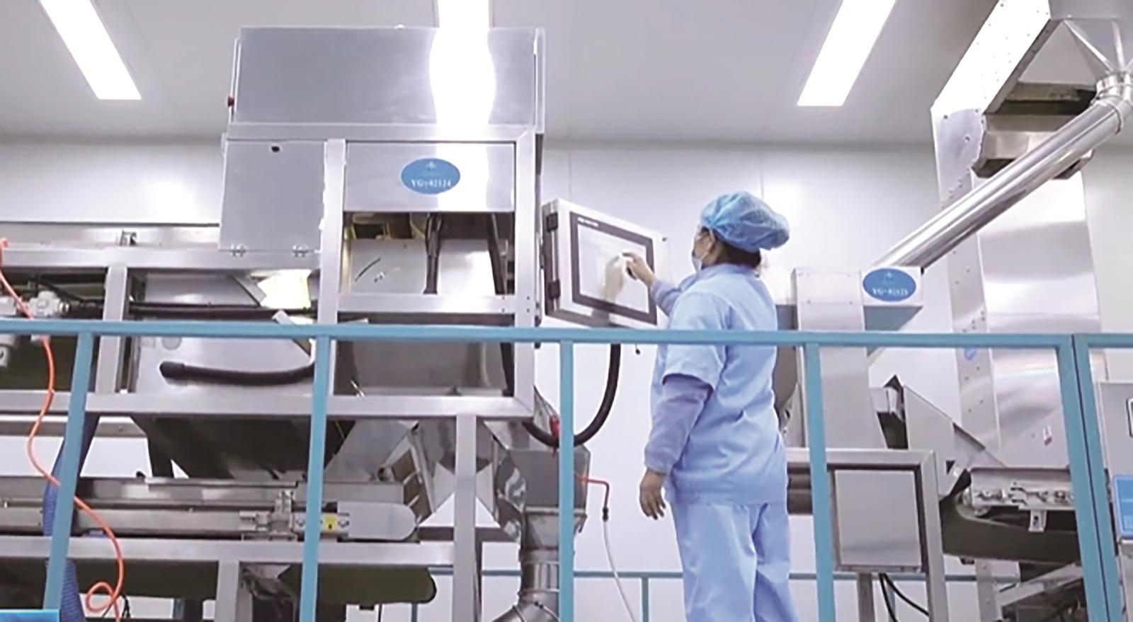 在五原县煜冠食品加工有限责任公司,经过色选机初筛后的南瓜籽仁被依次送进手选车间、灭菌车间、打包车间,最终等待发往世界各地。