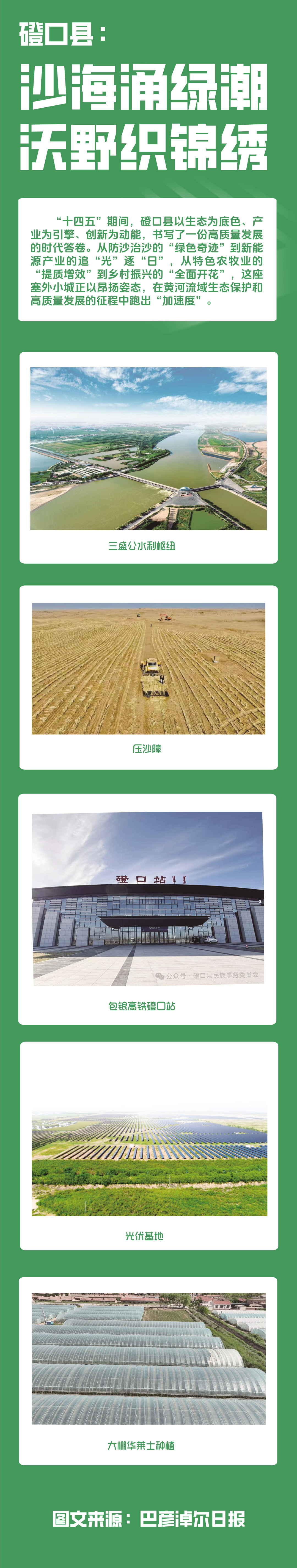 “十四五”期间,磴口县以生态为底色、产业为引擎、创新为动能,书写了一份高质量发展的时代答卷。从防沙治沙的“绿色奇迹”到新能源产业的追“光”逐“日”,从特色农牧业的“提质增效”到乡村振兴的“全面开花”,这座塞外小城正以昂扬姿态,在黄河流域生态保护和高质量发展的征程中跑出“加速度”。