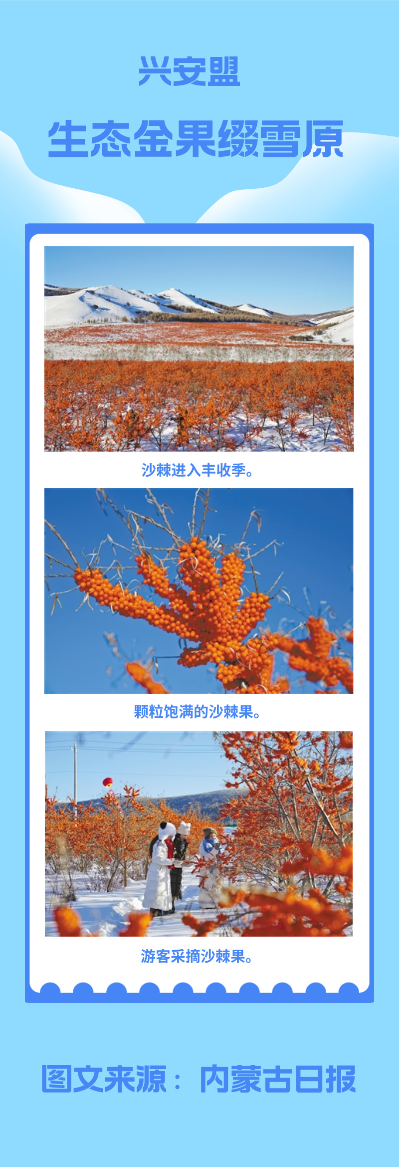 眼下,兴安盟阿尔山市7万余亩沙棘进入丰收季。在阿尔山沙棘果采摘基地,橙红饱满的沙棘果如红宝石般缀满枝头,在皑皑白雪的映衬下格外耀眼。游客们纷纷化身“冰雪采摘达人”,在寒冬中体验亲手采摘的乐趣。