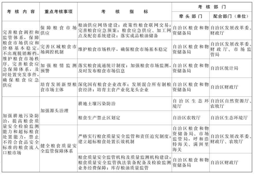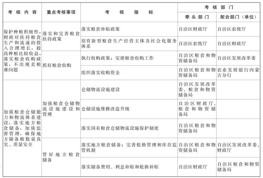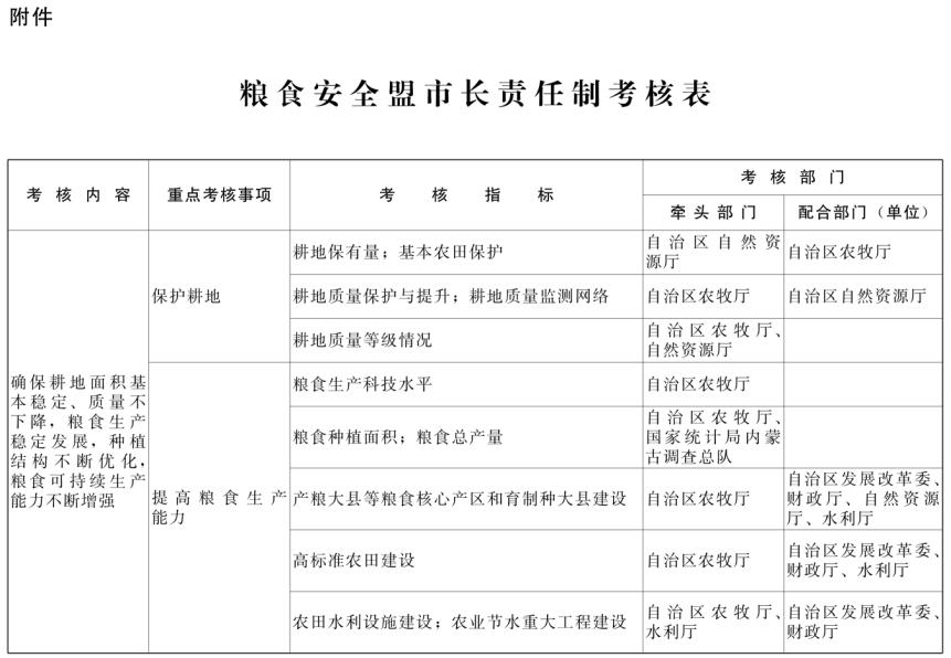 第六条  粮食安全盟市长责任制考核内容包括增强粮食可持续生产能力、保护种粮积极性、增强地方粮食储备能力、保障粮食市场供应、确保粮食质量安全、落实保障措施等6个方面,由各牵头部门具体落实(详见附件)。