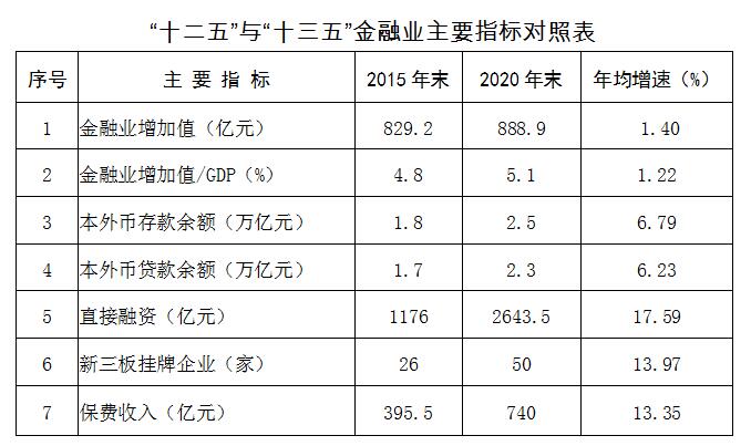 金融总体实力进一步增强。“十三五”时期,全区金融业增加值占GDP的比重从2015年的4.8%增长到2020年的5.1%,对经济社会发展的贡献度进一步提高。银行业存贷款规模稳步提高,全区金融机构人民币存款余额由2015年末的1.8万亿元增长到2020年末的2.5万亿元,年均增幅6.79%;贷款余额由1.7万亿元增长到2.3万亿元,年均增幅6.23%。保险业保费收入持续增长,由2015年末的395.5亿元增加至2020年末的740亿元,年均增幅13.35%。利用资本市场取得积极进展,2020年直接融资规模突破2000亿元大关,达到2643.5亿元,占社会融资规模比重逐年提高。“十三五”期间,新增1家公司在香港上市,1家公司进入全国首批新三板精选层。截至2020年末,全区共有境内上市公司26家,香港上市公司6家,新三板挂牌公司50家。