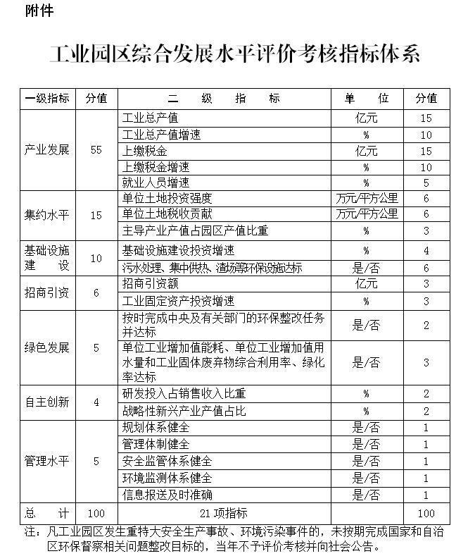 第二十条 坚持科学性、统一性、系统性、规范性、可操作性原则,科学设置评价考核指标。对园区产业发展、集约水平、基础设施建设、招商引资、绿色发展、自主创新、管理水平等方面进行综合评价。评价考核指标体系根据全区经济社会发展和园区管理实际进行调整。