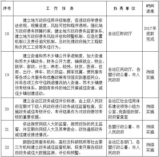 认真贯彻落实党中央、国务院决策部署和自治区党委、政府工作要求,充分认识政务诚信建设的重要意义,将坚持依法行政、阳光行政作为推进政务诚信建设的重要手段,不断提高政府行政效率,提升政府公信力;将建立政务领域失信记录和实施失信惩戒措施作为推进政务诚信建设的重要抓手,强化督导考评,不断提升政府诚信行政水平和公务员队伍诚信履职意识;将危害群众利益、损害市场公平等政务失信行为作为治理重点,建立健全满足我区经济社会发展和人民群众生产生活需求的政务诚信体系。