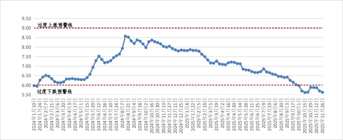11月份,受生猪出场价格下降及玉米批发价格波动影响,我区猪粮比价小幅下行。11月5日、12日、19日、26日全区猪粮比价分别为5.87:1、5.86:1、5.69:1、5.62:1,处于过度下跌三级预警区间。