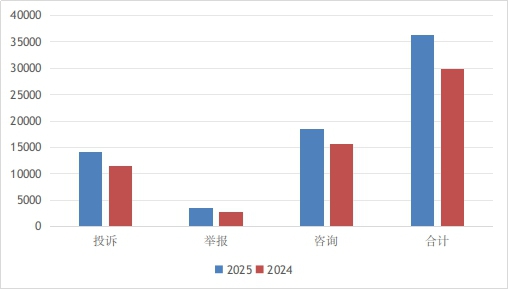 2025年4月份,内蒙古全国12315平台共接收消费者投诉、举报、咨询36235件,同比增长21.30%,环比增长0.74%。其中,投诉14147件,占总量的39.04%;举报3553件,占总量的9.81%;咨询18535件,占总量的51.15%。