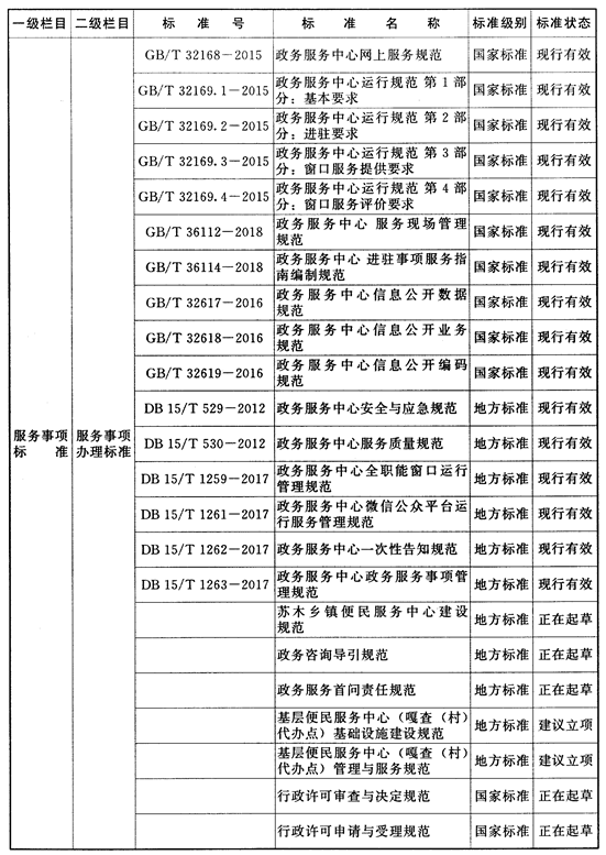 服务事项标准主要包括清单标准、行政权力事项标准和公共服务事项标准。该类标准规范了政务服务事项的事项名称、基本编码、设定依据、事项类型、实施编码、行使内容等信息。